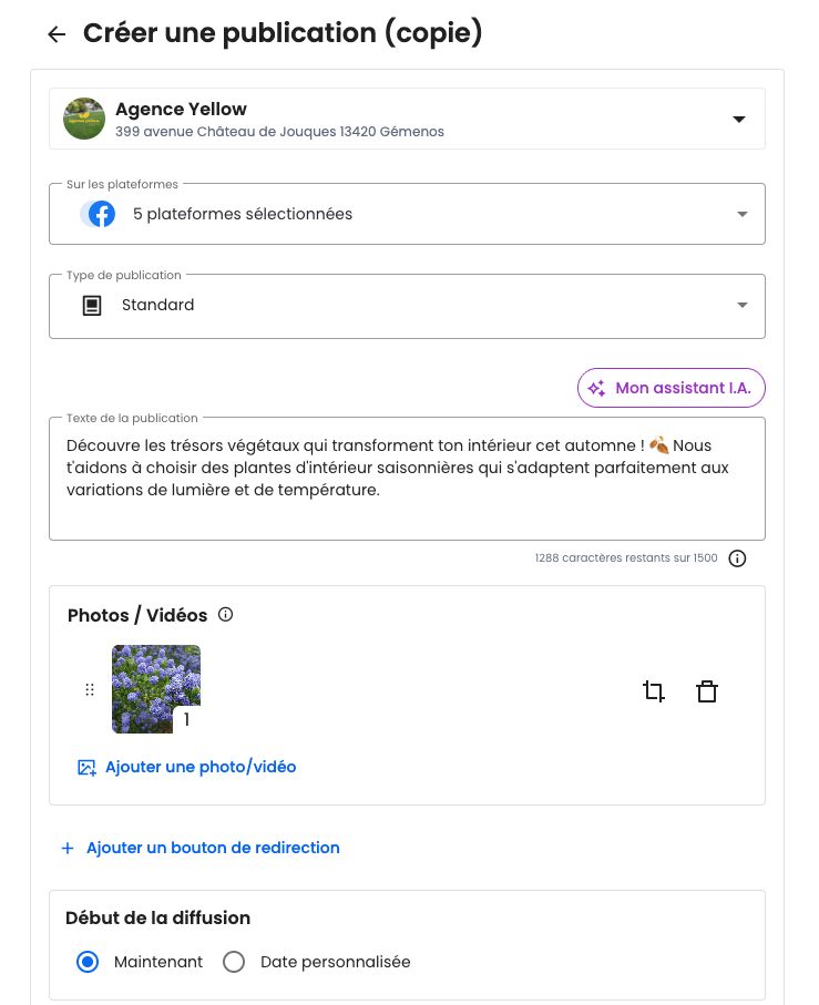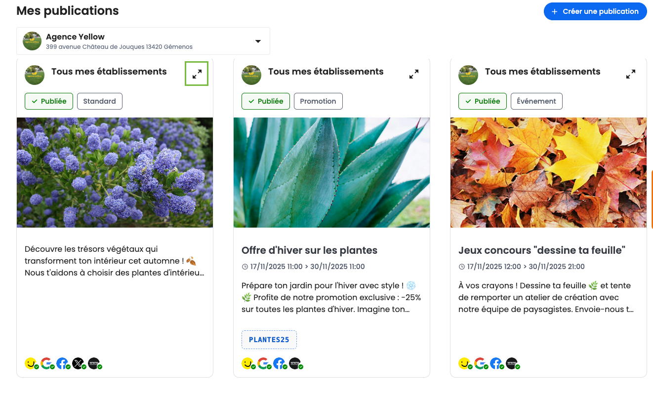 ℹ️ Les informations sur le choix des établissements et des plateformes de diffusion (Google, PageJaunes, Facebook, Instagram, X ..) ainsi que le type de publication ne seront pas modifiable.