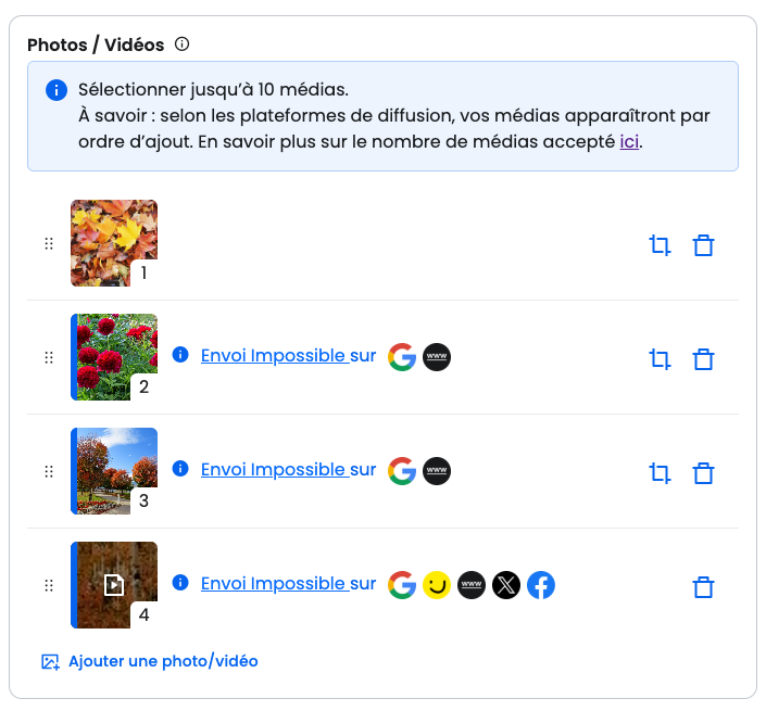 Lors de la création de votre publication, si celle-ci comprend plus de médias insérés vis-à-vis du nombre limité de médias imposé par les plateformes de diffusion (infos dans le tableau ci-dessus), un message d'information s'affichera à côté des médias concernés pour vous indiquer qu'ils ne seront pas pris en compte sur certaines plateformes. Mais cela ne vous empêchera pas de publier votre publication.