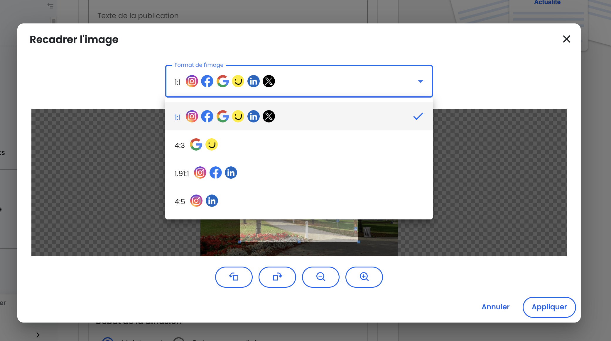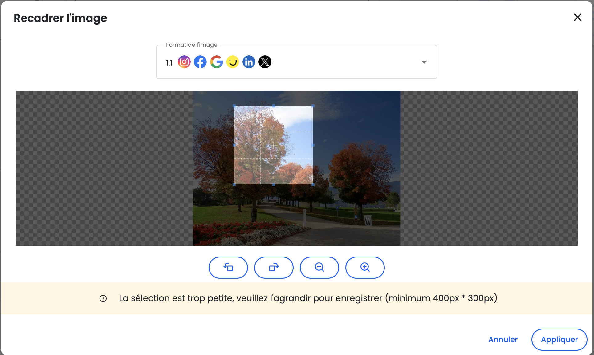 Vous pouvez donc choisir de recadrer et ajuster la taille de votre image avant mettre en ligne votre publication.
