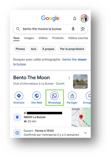 Cette fonctionnalitĂ©, disponible uniquement sur la version mobile de Google Search (non disponible sur Maps ou desktop) vous permet dâajouter un lien/bouton cliquable Whatsapp sur votre fiche Ă©tablissement.