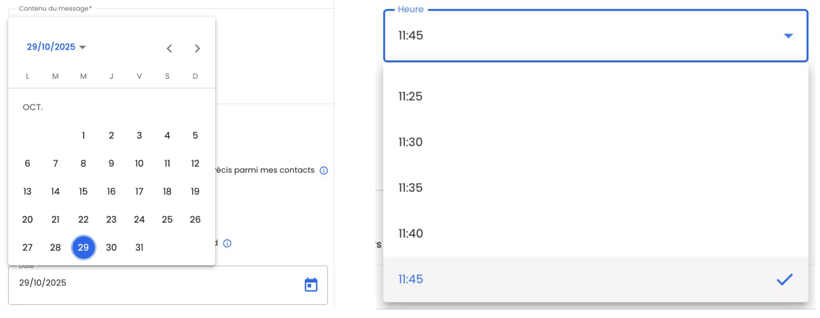 - Envoyer plus tard : sélectionnez une date via le calendrier (1) et une heure (2) via la liste déroulante (créneaux disponibles toutes les 5 minutes).