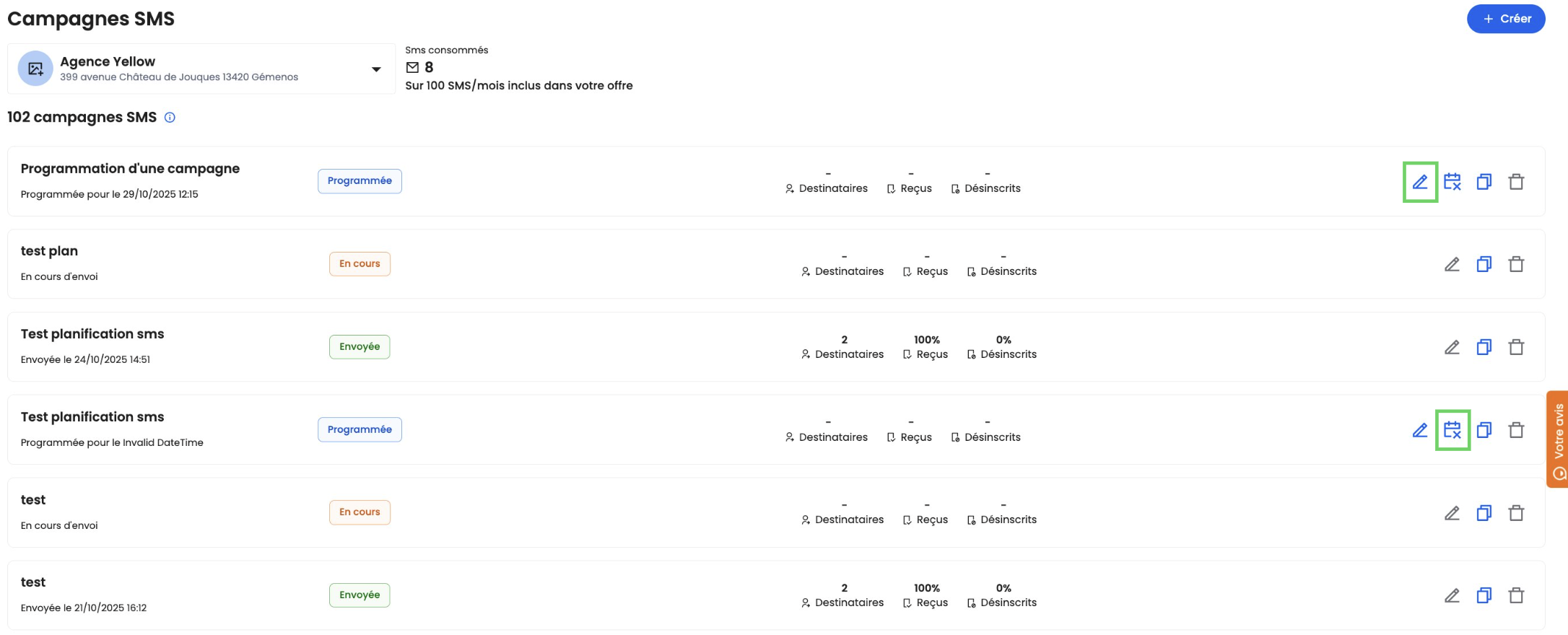 Vous pouvez modifier le contenu ou la date/horaire d’envoi via l’icône ✏️ dans la liste des campagnes, jusqu’à 10 minutes avant l’heure d’envoi