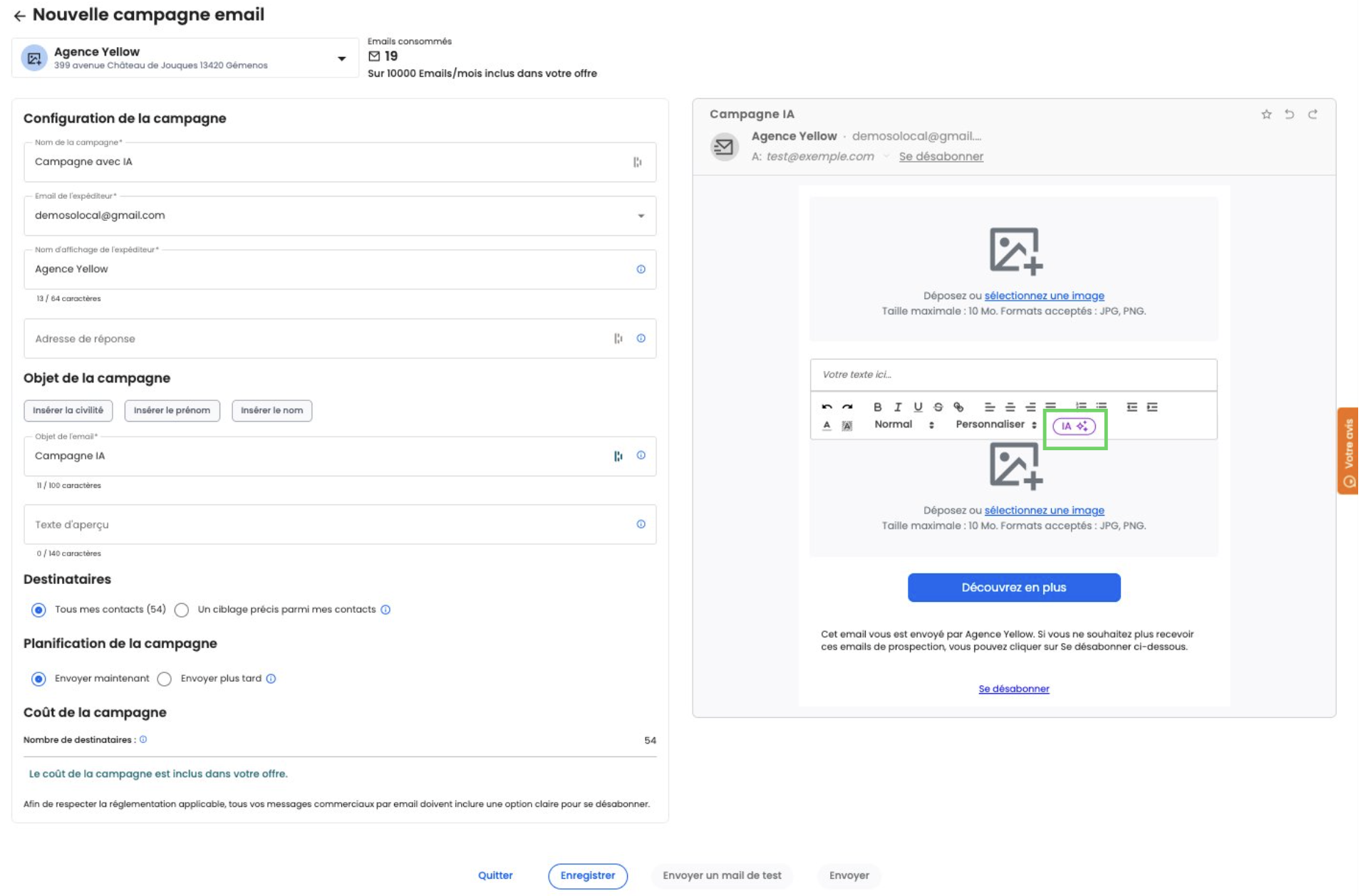 Dans l’éditeur de votre campagne, cliquez sur le bouton IA situé dans la zone de rédaction du contenu.