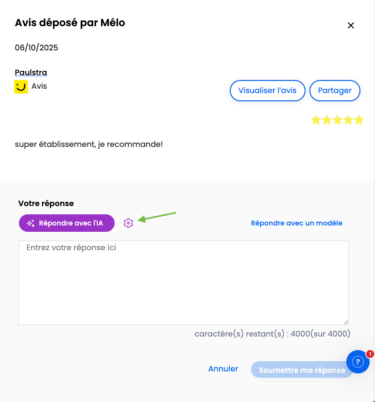 ℹ️ En effet, vous n'aurez pas à revenir sur votre paramétrage à chaque fois que vous souhaitez répondre avec l'IA. Votre configuration précédemment choisie a été sauvegardée pour l'ensemble de vos établissements.