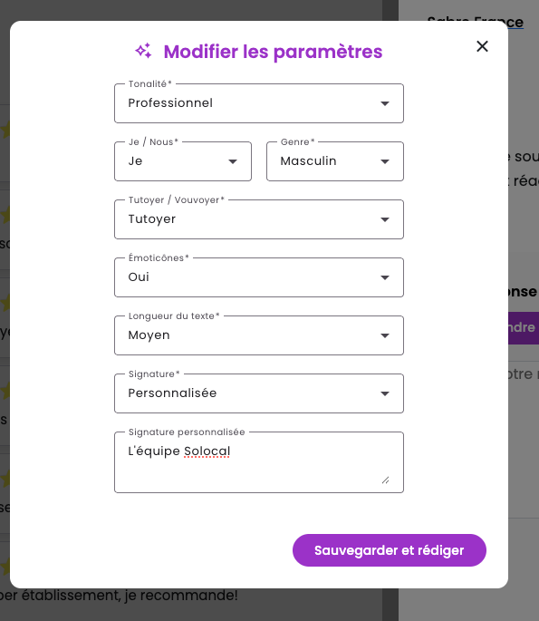 En revanche, si vous souhaitez modifier cette configuration, vous pouvez à nouveau réouvrir l'écran de paramétrage et ajuster votre style de réponse. Cliquez à nouveau sur "sauvegarder et rédiger" pour enregistrer votre nouvelle configuration pour les prochaines réponses. Celle-ci remplacera l'ancienne configuration.⚠️