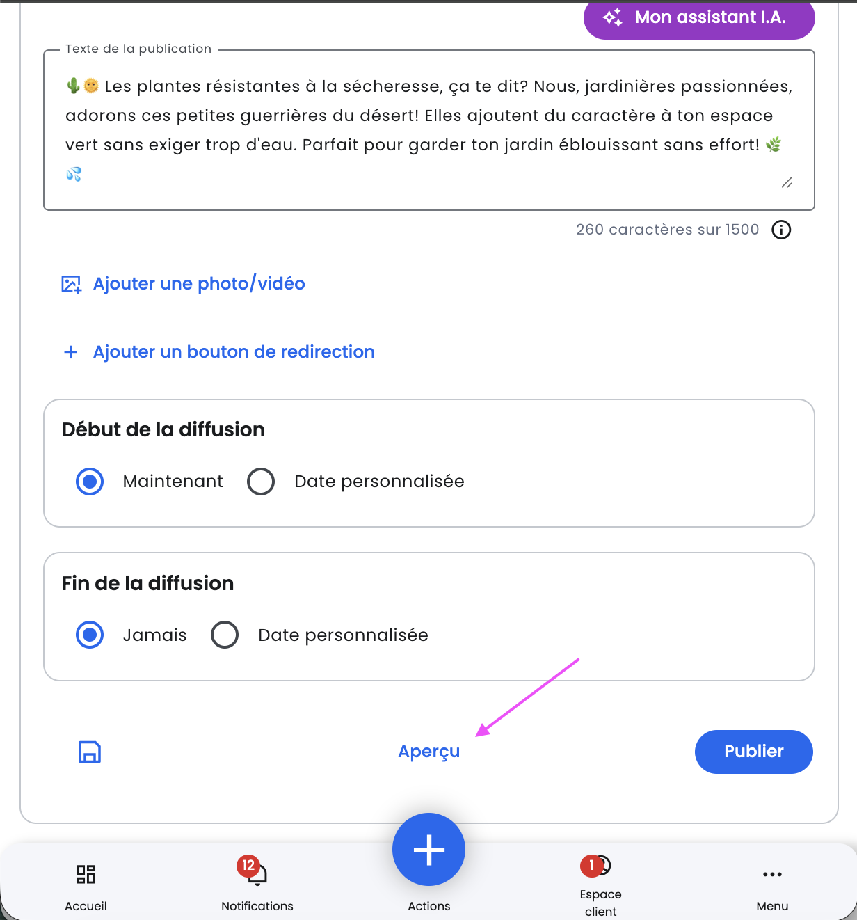 - En version mobile, la prévisualisation de vos posts est disponible via le bouton "aperçu" en bas de votre formulaire de création.