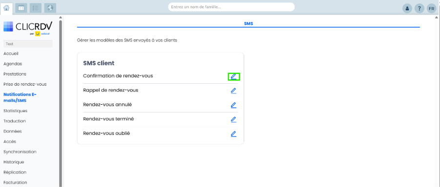 - Sur la page de gestion des modèles de SMS, choisissez le SMS que vous souhaitez personnaliser en cliquant sur le “crayon”