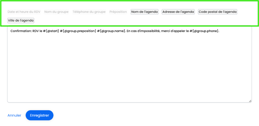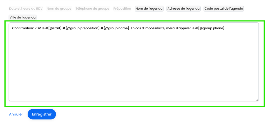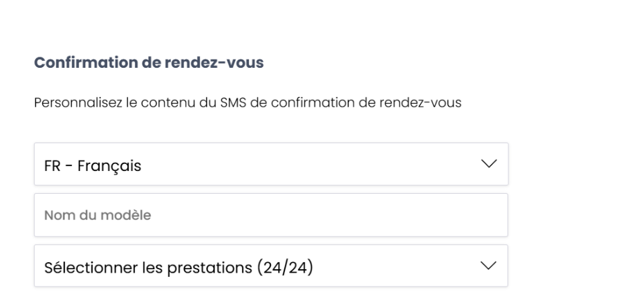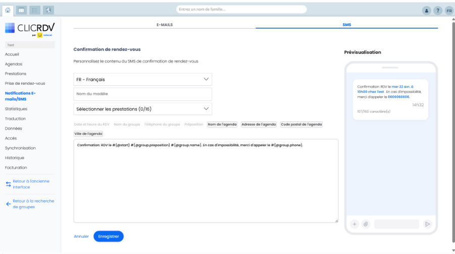 La fonctionnalité de personnalisation des SMS vous permet d’adapter les messages envoyés automatiquement à vos clients (confirmation, rappel, annulation, fin ou absence à un RDV).