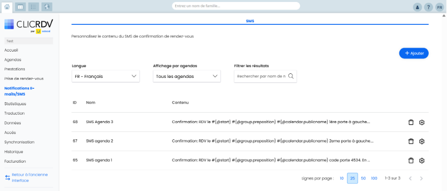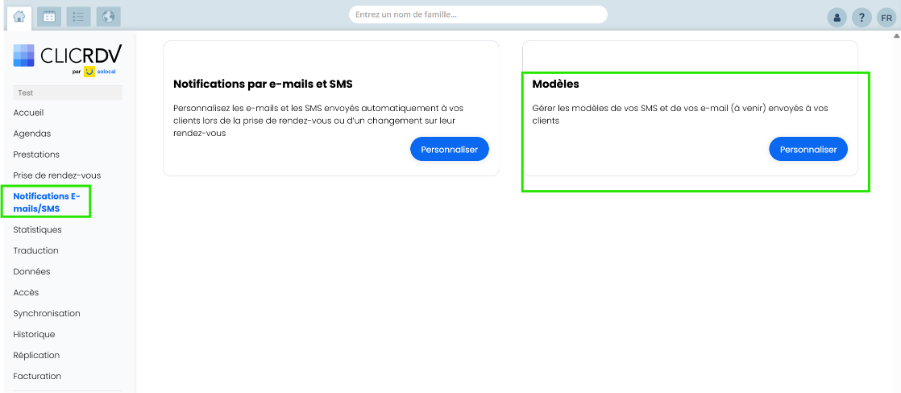Vous pouvez désormais gérer ces modèles depuis le menu Notifications E-mails/SMS de votre nouvelle interface ClicRDV.