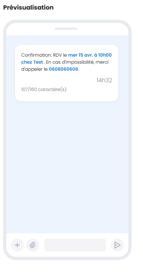 À droite de l’écran, un aperçu vous permet de visualiser le SMS personnalisé et de suivre le nombre de caractères utilisés en temps réel.