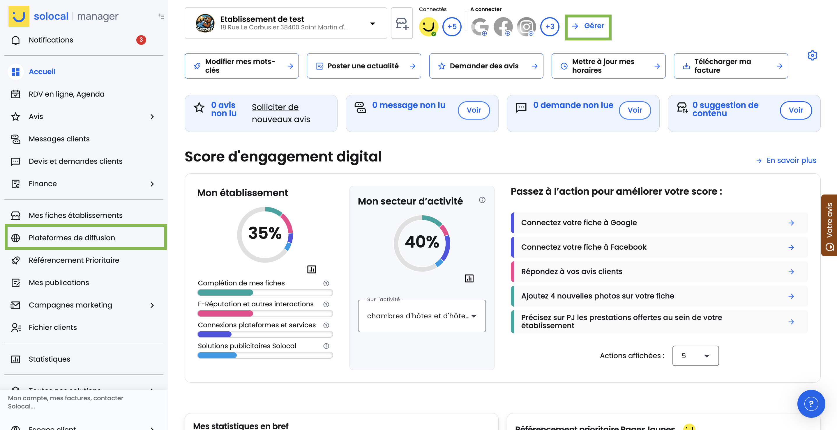 Vous pouvez mettre à jour les informations de votre établissement depuis solocal manager, gérer vos avis, créer et programmer des publications.