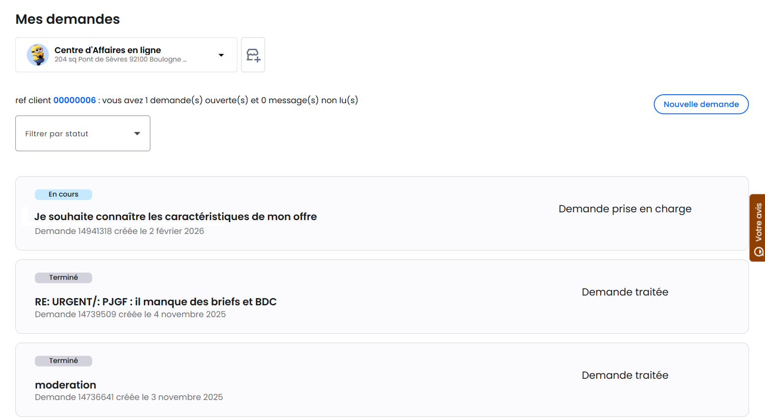 La page « Mes demandes », accessible depuis le menu Espace Client (en bas à gauche), vous permet de consulter l’ensemble de vos demandes ainsi que le statut associé à chacune d’entre elles.