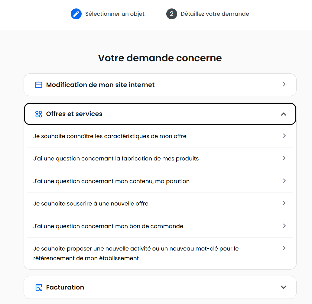 - Sélectionnez une thématique, puis le motif de votre demande.