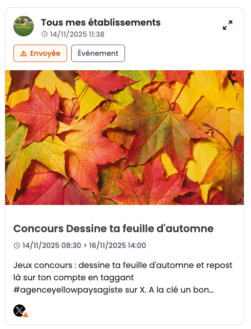 | Envoyée ⚠️ | L’icône warning signale une erreur, la publication n’a pas été publiée sur le média concerné. Ouvre le volet de votre publication pour en savoir plus et comprendre la raison de l'erreur. |