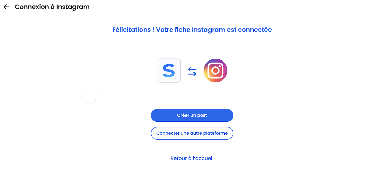 Félicitations ! Vous êtes en cours de connexion/connecté à Instagram ! Vous pouvez désormais programmer et publier des posts Instagram directement depuis Solocal Manager.