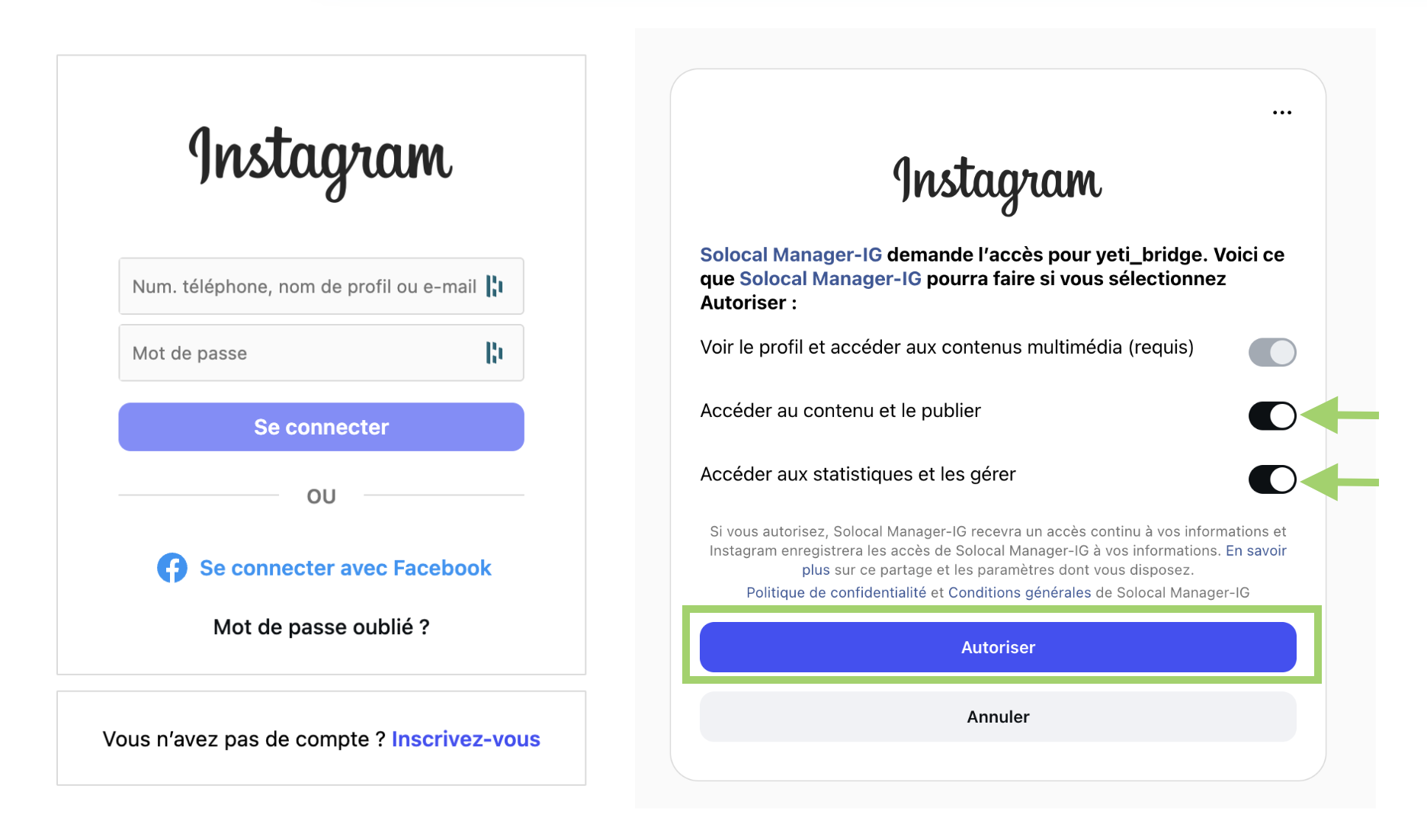 Vous êtes redirigé sur la page d'identification d'Instagram, renseignez vos identifiants, acceptez de donner TOUS les droits de gestion à Solocal Manager.